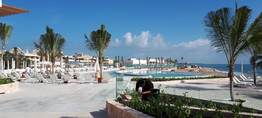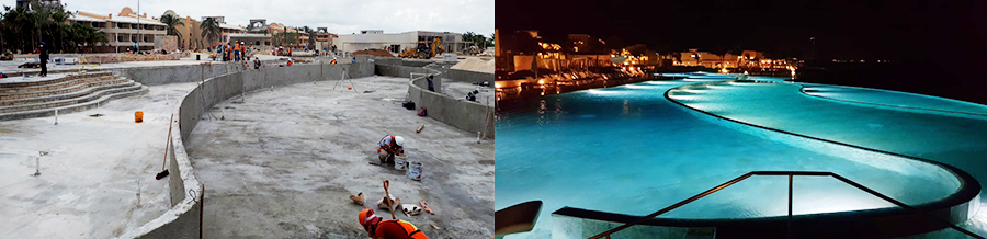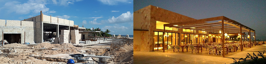 Obra realizada: despalme, terracerías, obra civil, albañilerías, acabados en alberca, cuarto de máquinas, rehabilitación de alberca de sal, toalleros, bares, Beach Club Helios, asoleaderos, andadores.